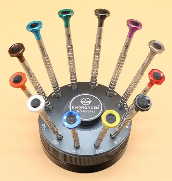 W9359 Set of 12pcs Steel Handle Ball Bearing Watch Repair Screwdrivers with Metal Stand and Extra Flat Blades 0.5mm to 3.0mm